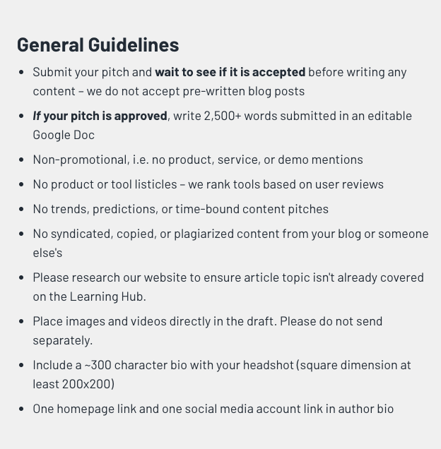 In early 2019, I began editing guest blogs for G2.com. By the end of that same year, I had created full editorial guidelines for contributors, found here: https://learn.g2.com/guest-post-guidelines.